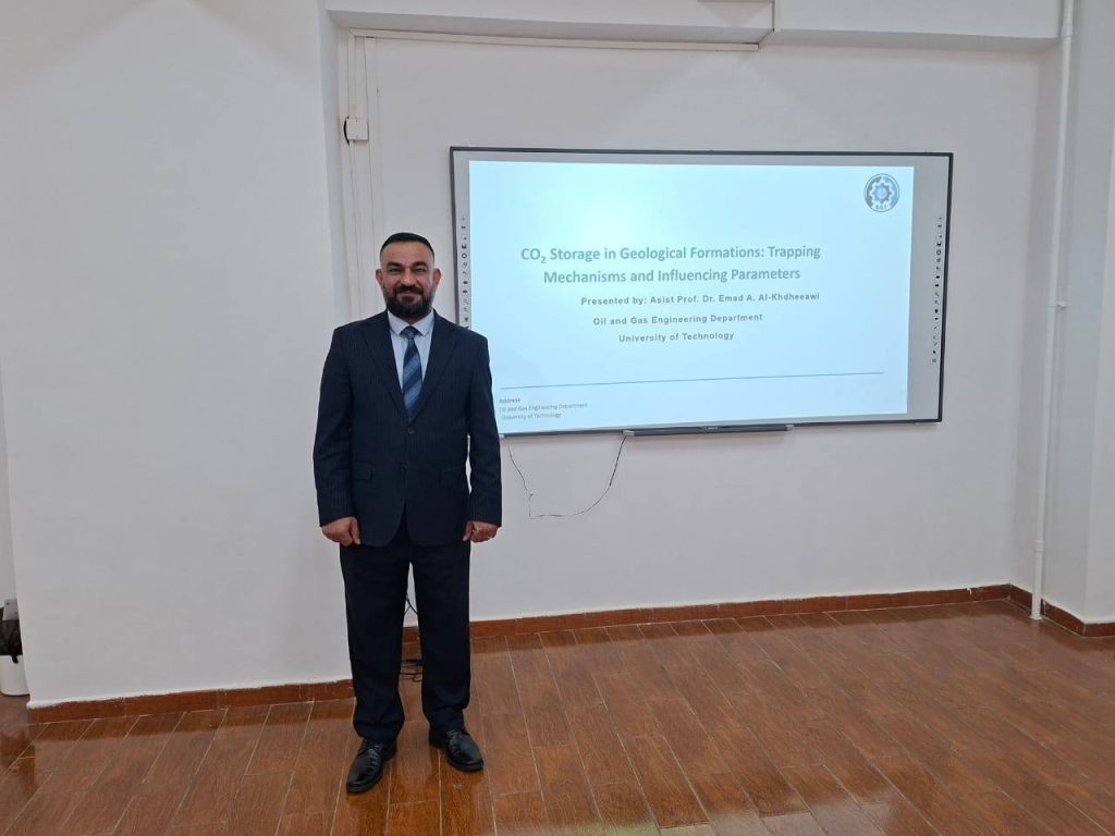 حيث تناولت المحاضرة أحدث الأساليب العلمية والبحثية لتخزين غاز ثاني أوكسيد الكربون في التكوينات الجيولوجية، وأهمية هذه الآليات في الحد من الانبعاثات الكربونية وتأثيرها على البيئة والصناعة النفطية. وقد ركز الدكتور فاخر خلال المحاضرة على آليات الاحتجاز، والمعايير المؤثرة في فعالية التخزين الجيولوجي، مبينًا أهمية هذا المجال في دعم توجهات الاستدامة والابتكار بمجال الطاقة.